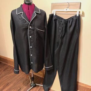 | Treadlette Tuesday Every Tuesday we share projects and ideas from our lovely Treadle Yard Goods employees, The Treadlettes! Laura made these luxurious black linen pajamas for one of her custom sewing clients. She used Vogue 8964 and added more piping for plenty of pop! The wearer reports they are "wonderful, seemingly perfect in all aspects!" |