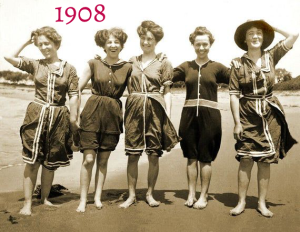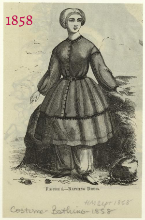 Friday Fun Fact! Memorial Day is typically the beginning of summer. Swimming pools open, the weather is heating up, and visiting the beach is looking pretty good, so today let's look at a selection of vintage swimwear! Before the mid-19th century, people generally swam wearing little more than nature gave them, but in the 1850s, mixed-sex swimming beaches became more common, so bathing dresses were worn. 1850s bathing dresses generally consisted of a knee-length tunic, full trousers gathered to the ankle, stockings, shoes, and a cap. It would have been difficult to swim athletically in this ensemble, but it worked for splashing around and having fun in the water. As the 19th century progressed, swimming costumes retained the same basic idea of tunic and loose pants, but became shorter and cut closer to the figure. The 1870s example shows quite a difference in the amount of fabric used! Sure, it's still a whole dress AND pants, but it's shorter and slimmer, and has little cap sleeves instead of big full-length poofs. By the 1890s the shoes and stockings could be ditched and occasionally the skirt was left off, leaving a loose romper style. It wasn't until the 1920s that the skin-tight leotard style came into fashion for women, and it was another decade before it was universally the norm. After that, variations on the basic leotard continued into the strapless, two-piece, and eventually the bikini. Many modern swimsuit styles have moved back toward more modest coverage, often due to concerns about sun protection, but also because it's great to have options! Want to see MORE? I definitely couldn't fit every example I wanted into this email, so you can head over to the blog for more swimsuit fun. |