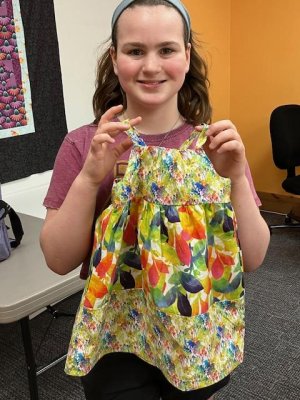 Here's Skylar enjoying our after-school sewing camp! She made this adorable little girl's dress for her neighbor. It's her first time working from a pattern! |