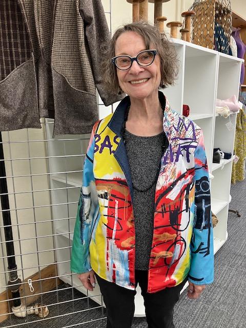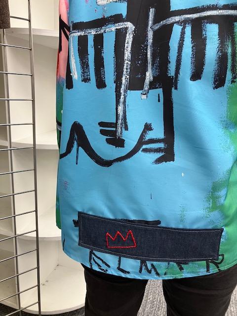 Lisa cut this Tania coatigan from a ready-to-wear windbreaker-style jacket featuring the work of Jean-Michel Basquiat, her favorite artist. What an absolutely incredible reworking of an extant garment!![]() ![]() |