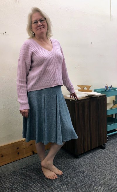 Finally, frost! Rebecca was dressed for the cold but kindly consented to model her Haxby skirt: |