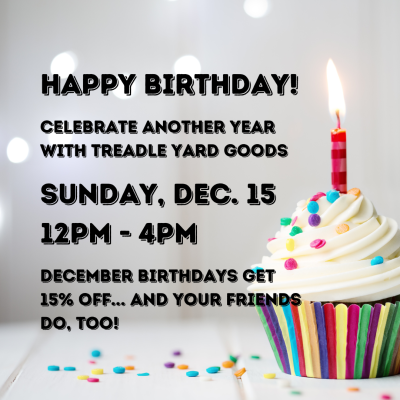 ... and we've restocked our felt charm packs, both brights and pastels! ![]() And of course there's the matter of this month's birthday party! Were you born in December? Make a gift to yourself: Stop into Treadle Sunday December 15 between 12 and 4 for our monthly birthday party! You'll get 15% off almost everything in the store: fabrics, patterns, notions, and more! Bring a friend and they get 15% off too... and there's yummy treats for everyone! |