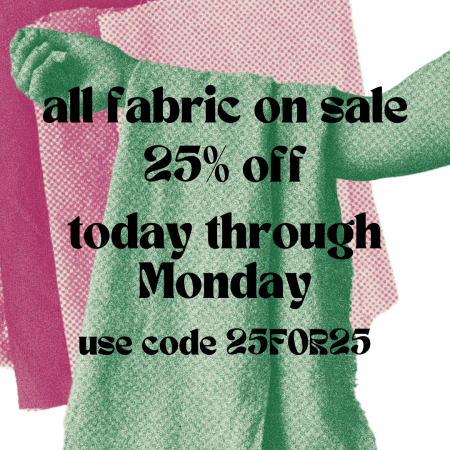 What else is there to say? 25% off fabric, now through Monday. It's simple. It's clear. Use the code 25FOR25 on our website, or come in—because we don't put remnants and reused fabrics online. Slubby silk, striped linen, and astonishing wool of all colors could be yours for 25% off an already discounted price. Reloved silk clocks in at $15; you do the math. |
