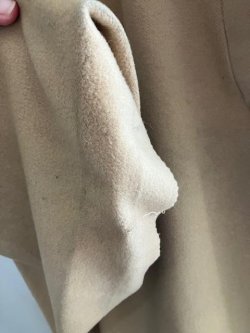 One of my favorite things about vintage clothing is the opportunity to examine construction techniques from a different era. This coat has minimal tailoring for support, probably because the cashmere is so soft and drapey. Hair canvas is stitched into the seams in the front to help it hold its shape, along with a lightweight cotton back shield. Shoulder pads are almost nonexistent, just 3 layers consisting of hair canvas and cotton to create a smooth silhouette across the shoulder.