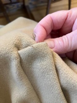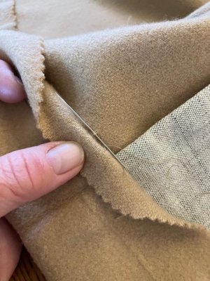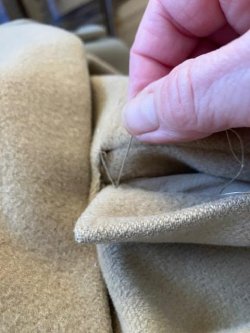 Finally, a simple catch stitch for the hem (that also needed a bit of repair). You may notice the additional crease on the hem, indicating that the original owner had the coat shortened. I am so glad she was about my height!